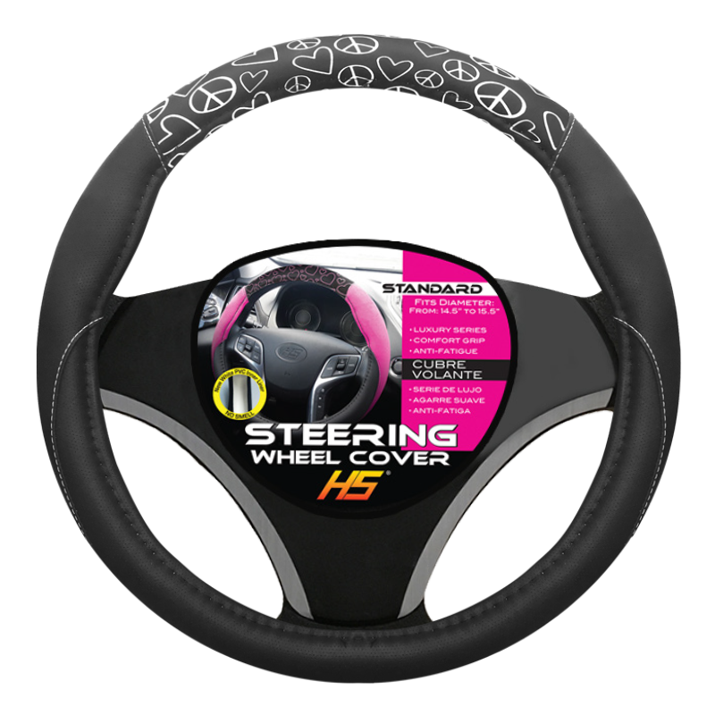 Steering Wheel Cover, Designer, White Peace & Hearts, Black, 14.5″-15.5″