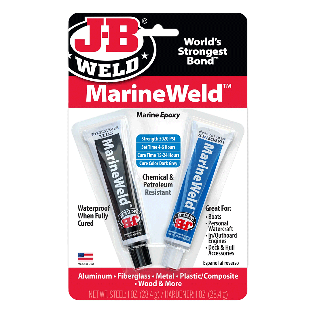 J-B Weld MarineWeld is a specially formulated two-part epoxy cold weld system that provides for strong, lasting repairs for bonding different or similar surfaces, such as aluminum, metal, composites, fiberglass and others. MarineWeld sets in 4-6 hours at room temperature and is fully cured to a dark grey color in 15-24 hours. Once cured, it can be shaped, tapped, filed, sanded and drilled and will retain its strength above or below the waters’ surface. MarineWeld has a 1:1 mixing ratio and tensile strength of 3960 PSI.